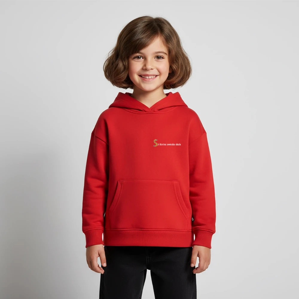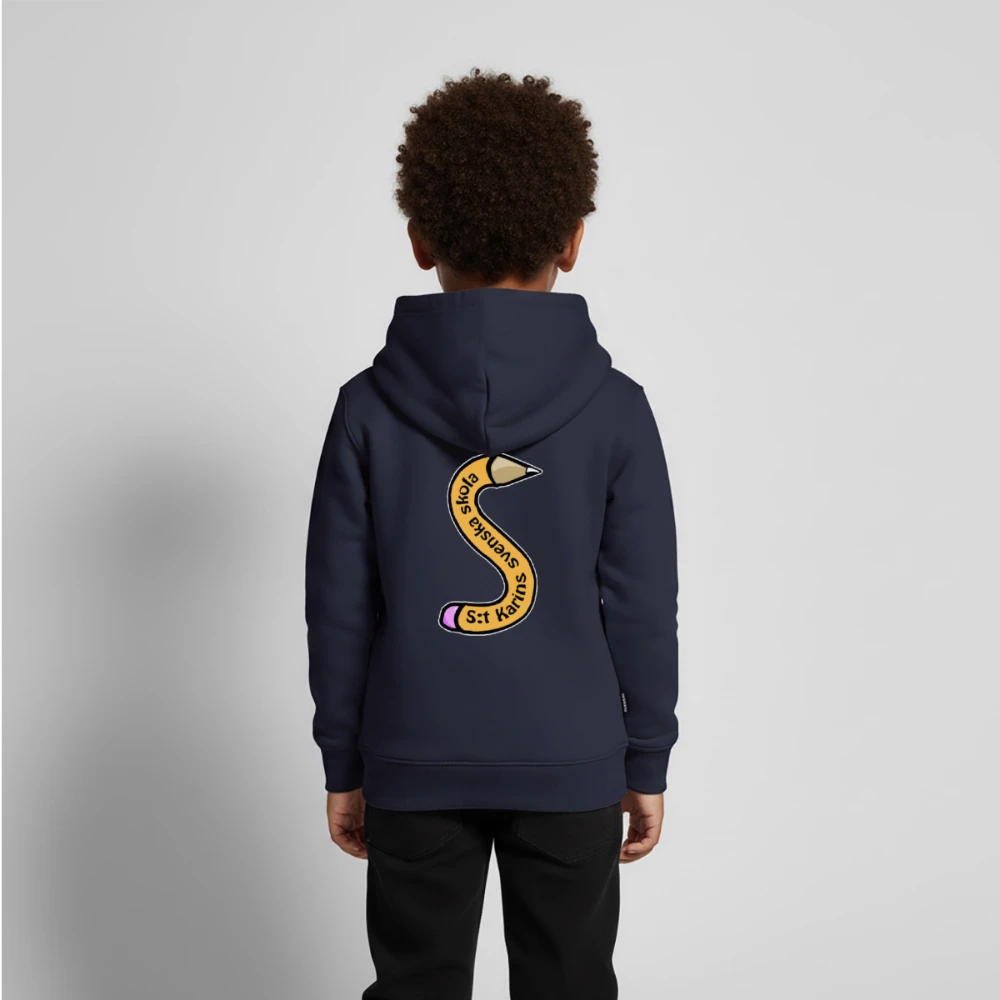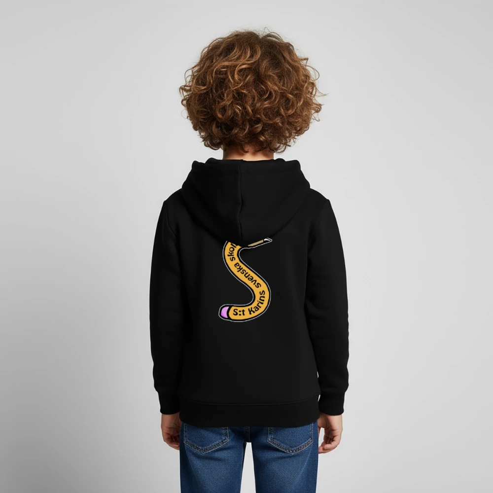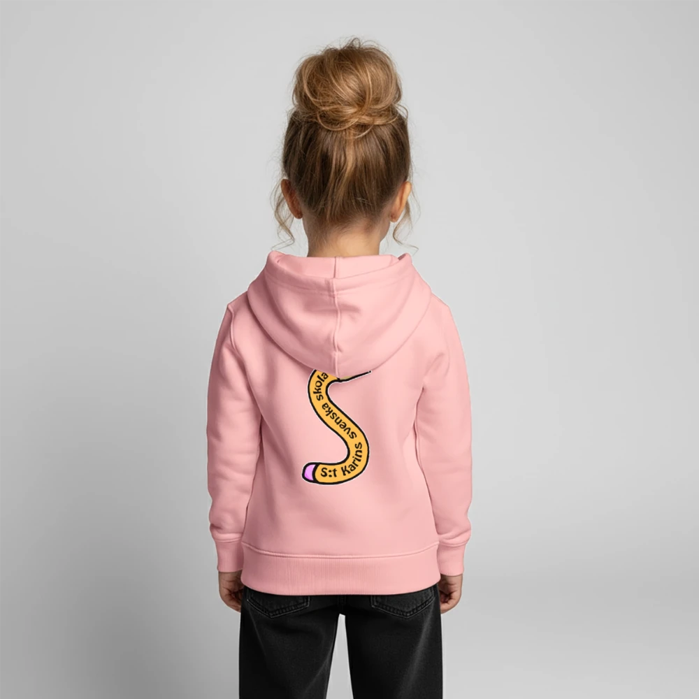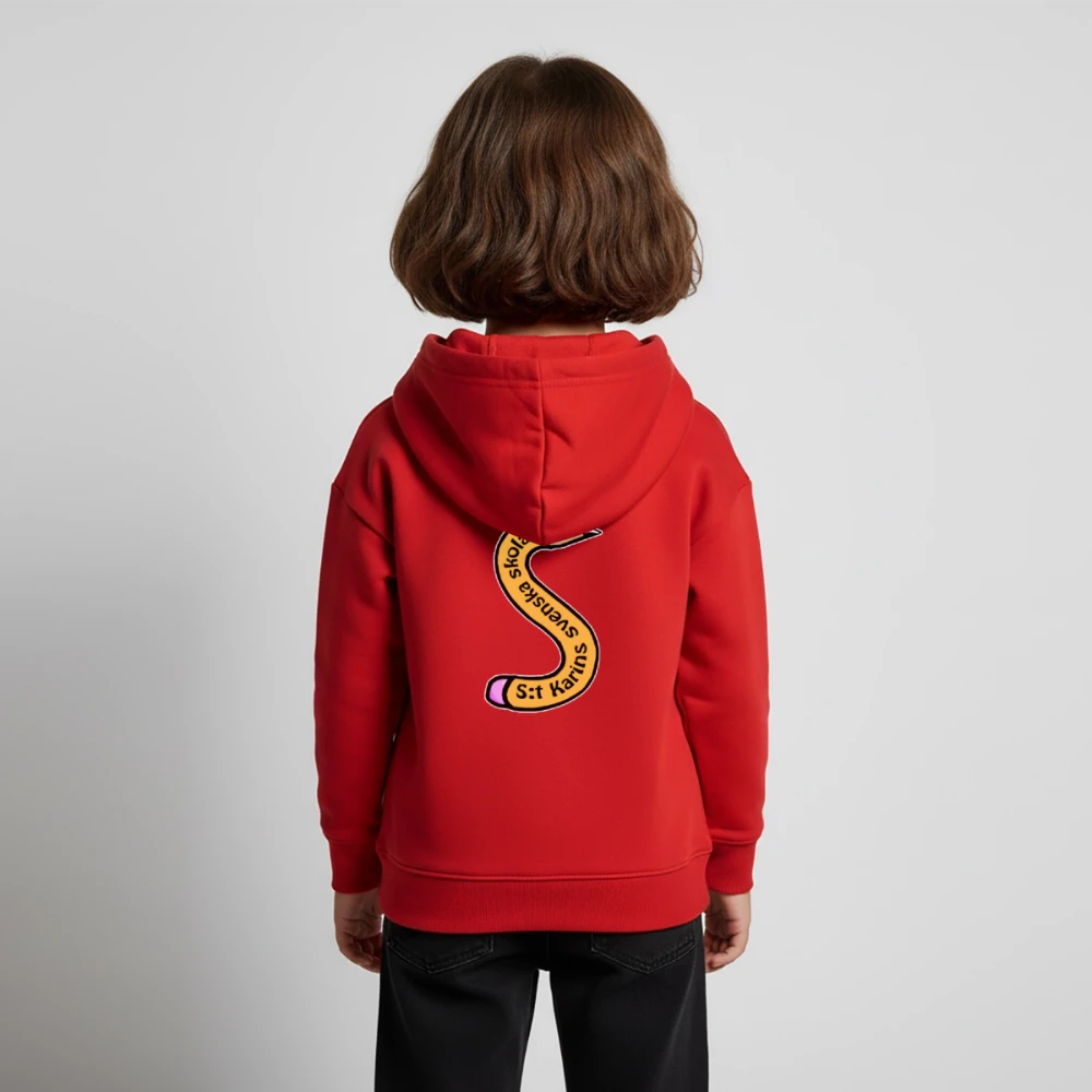 Huppare – St: Karins svenska skola 116-164 är en mysig favorit för svala dagar. Den har skolans textlogo på bröstet och en stor penna-logo på ryggen. Luvan är tjock och skön utan snören, och framtill finns en praktisk känguruficka. Perfekt för både lek, skola och vila.