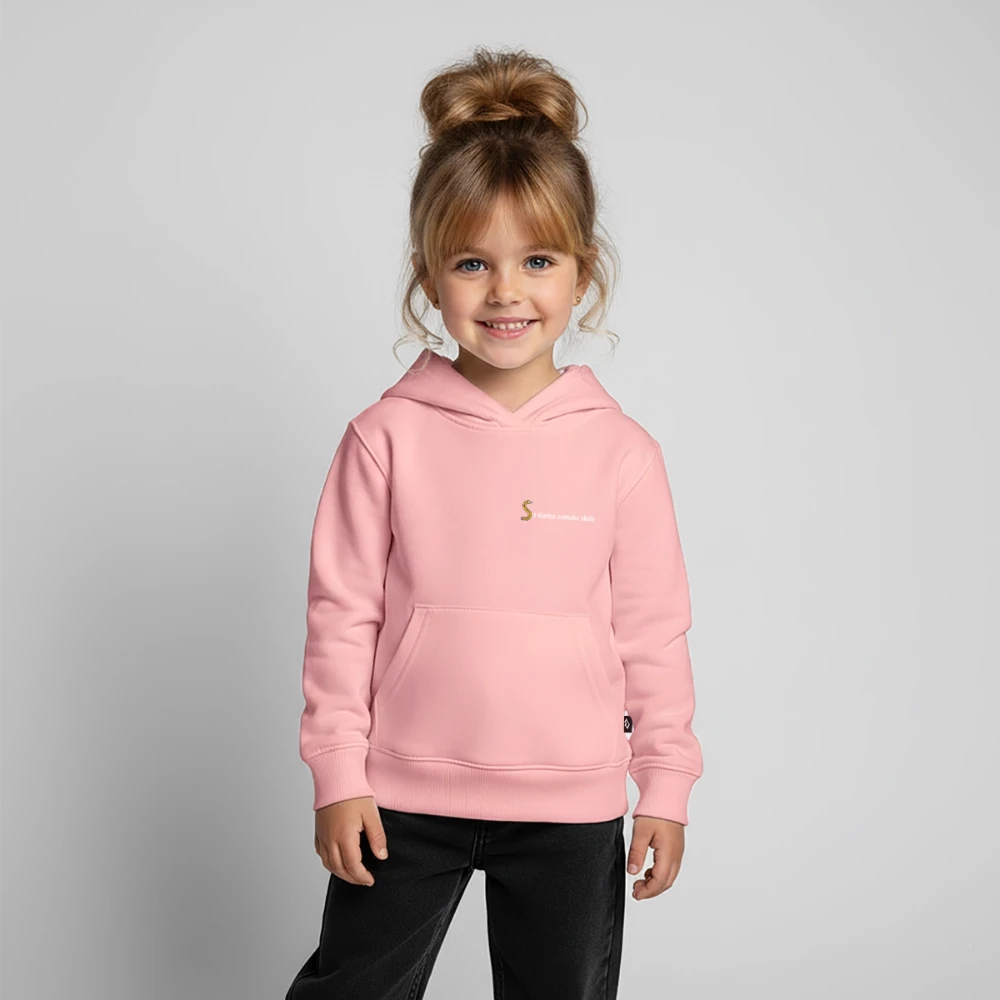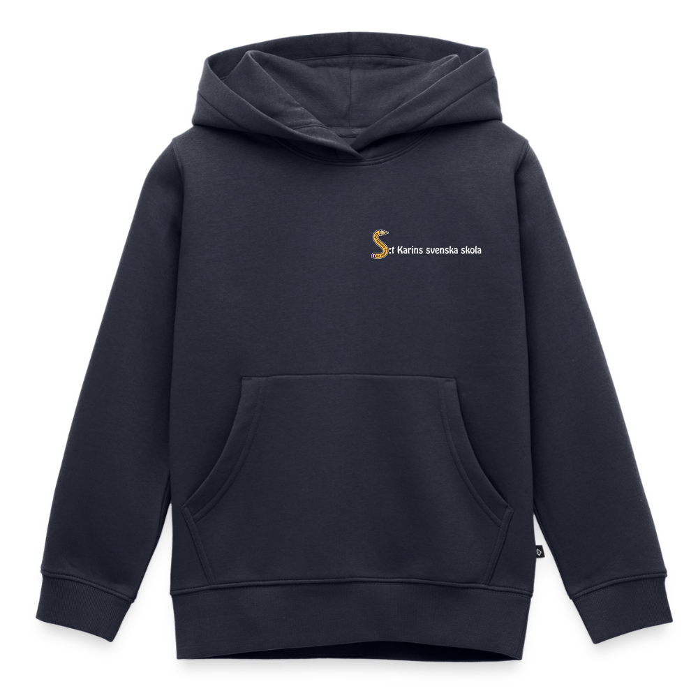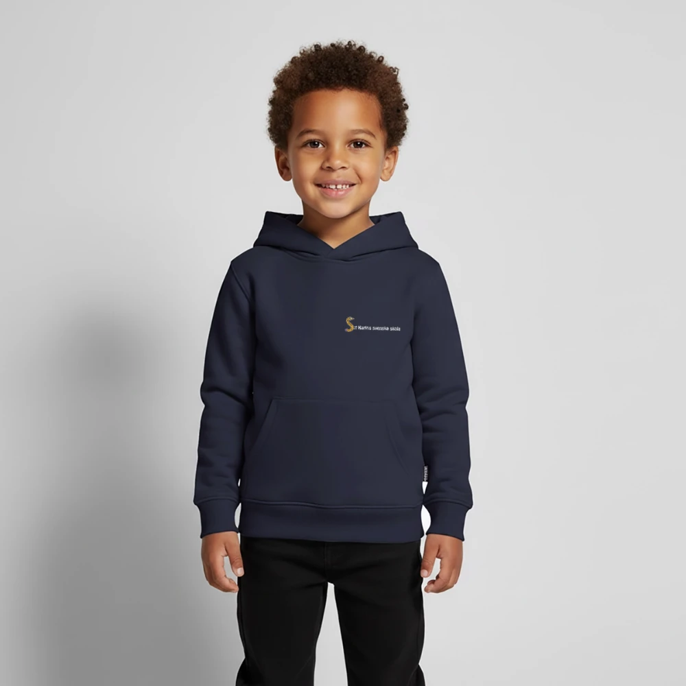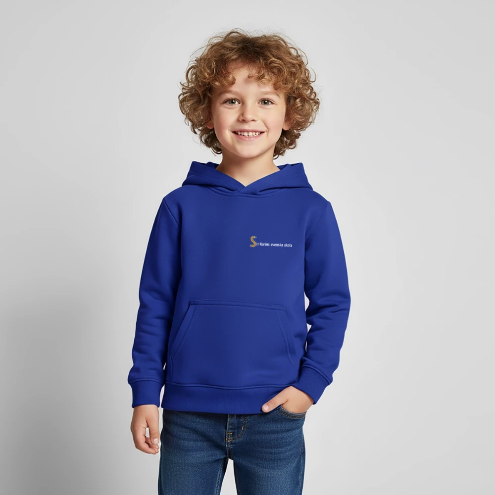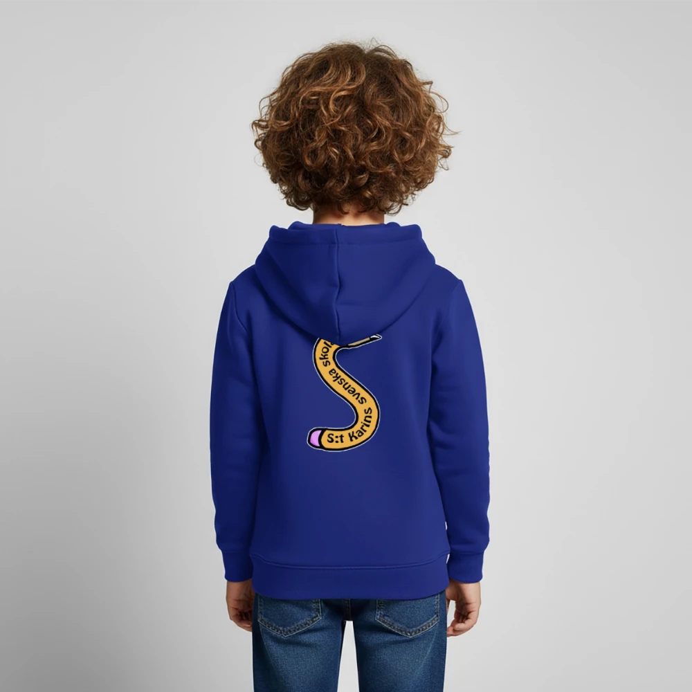 Huppare – St: Karins svenska skola 116-164 är en mysig favorit för svala dagar. Den har skolans textlogo på bröstet och en stor penna-logo på ryggen. Luvan är tjock och skön utan snören, och framtill finns en praktisk känguruficka. Perfekt för både lek, skola och vila.