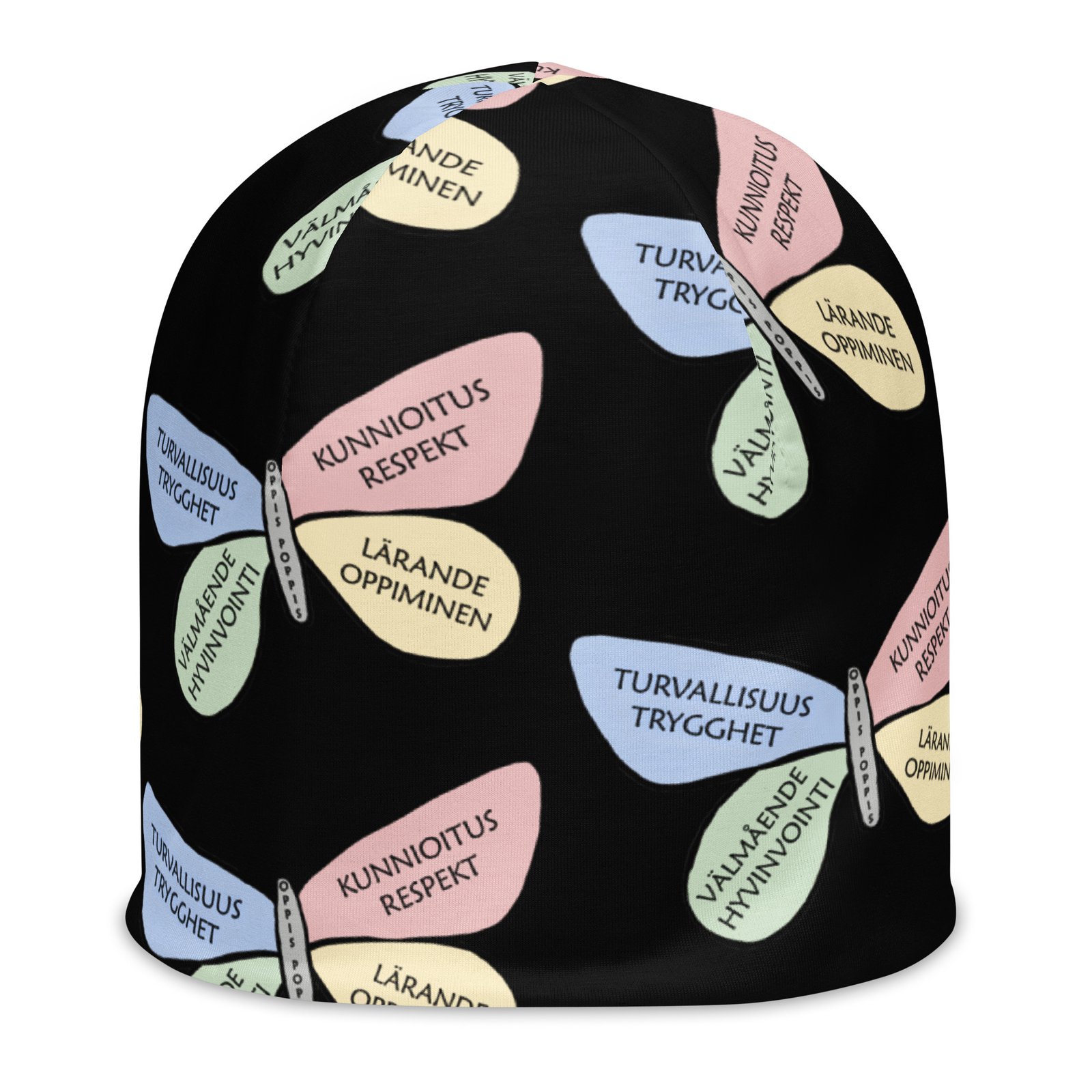 Mössa – Fjäril är en mjuk och värmande mössa för kyliga dagar. Den svarta botten har ett fint mönster med OppisPoppis-fjärilen över hela mössan. Tyget är stretchigt och bekvämt, och den dubbla lagret gör den extra varm. Perfekt för både vardag och lek utomhus.