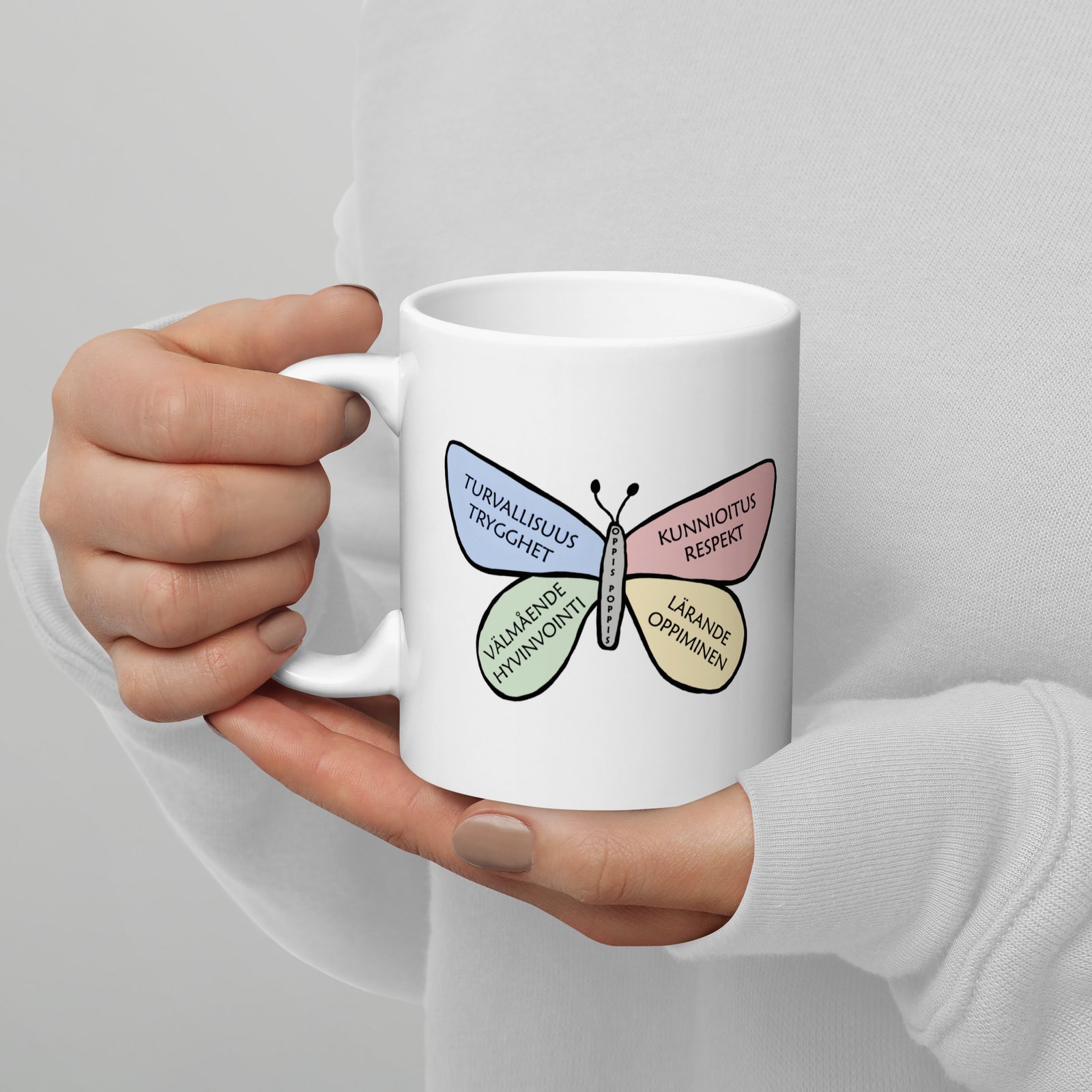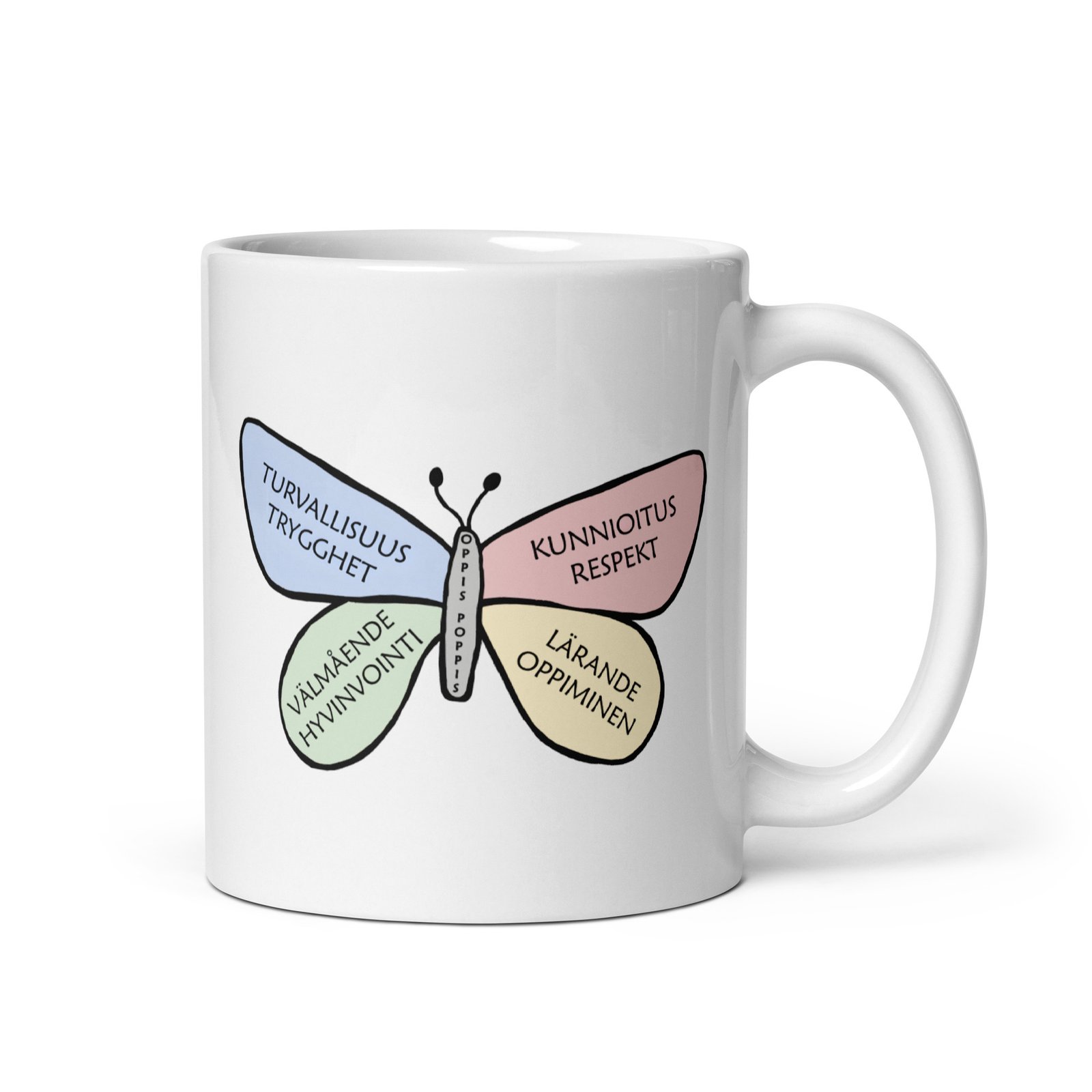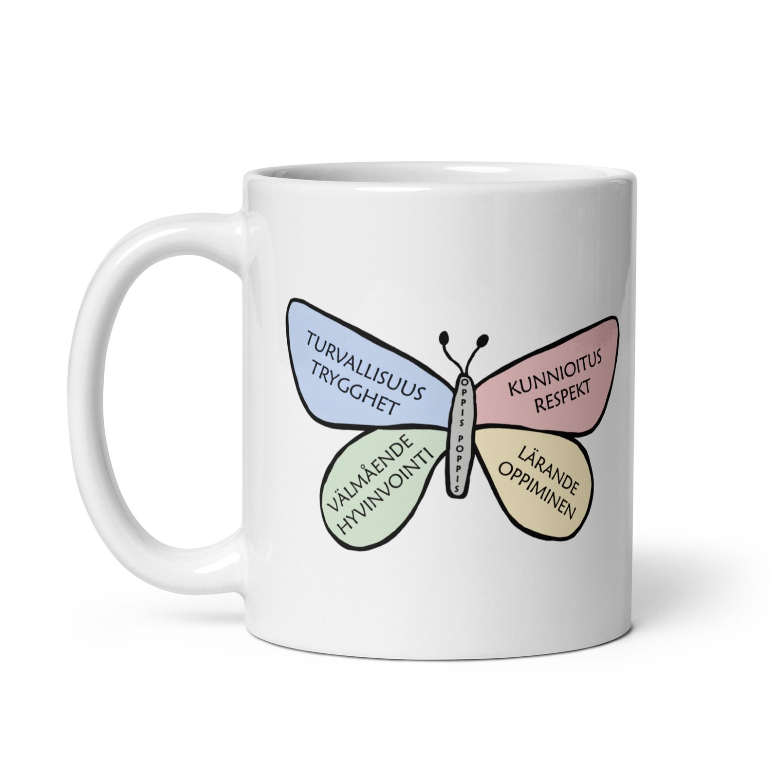 Mugg Fjäril sprider lite extra glädje vid varje klunk. Den fina OppisPoppis fjärilen syns på båda sidor av muggen och ger en mjuk och lekfull känsla. Muggen är stadig och blank med ett tydligt tryck som håller länge. Perfekt för kaffe, te eller varm choklad, och enkel att använda varje dag.