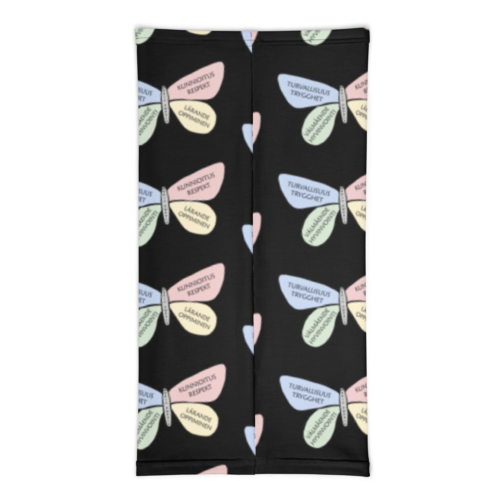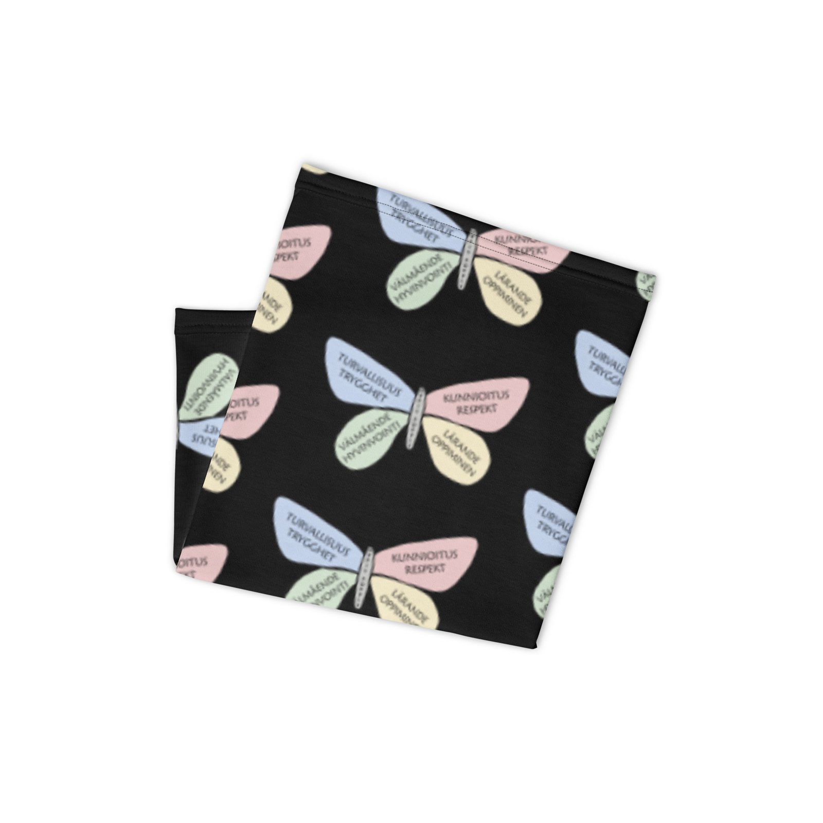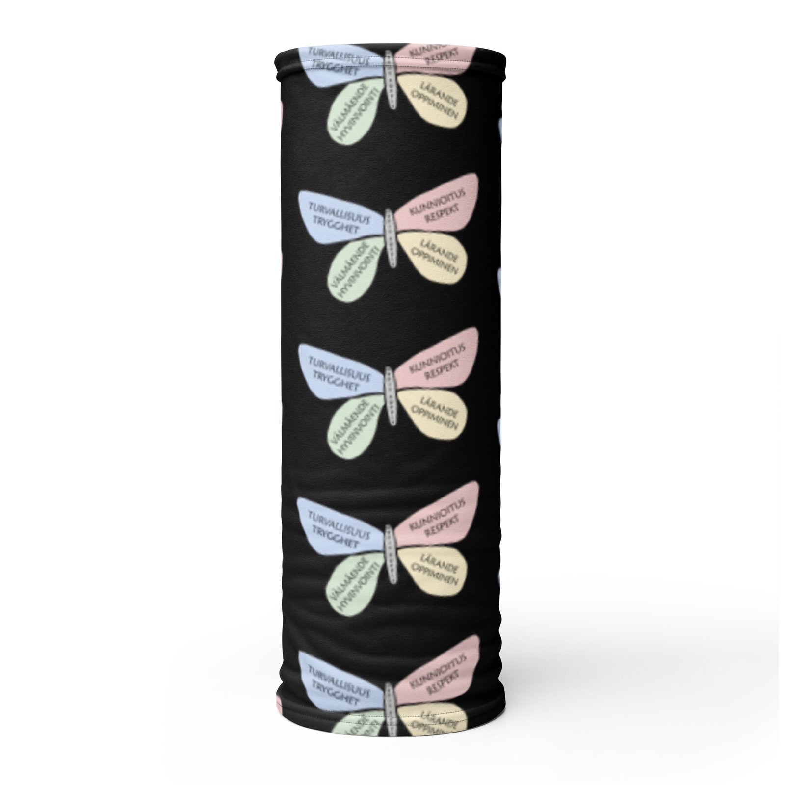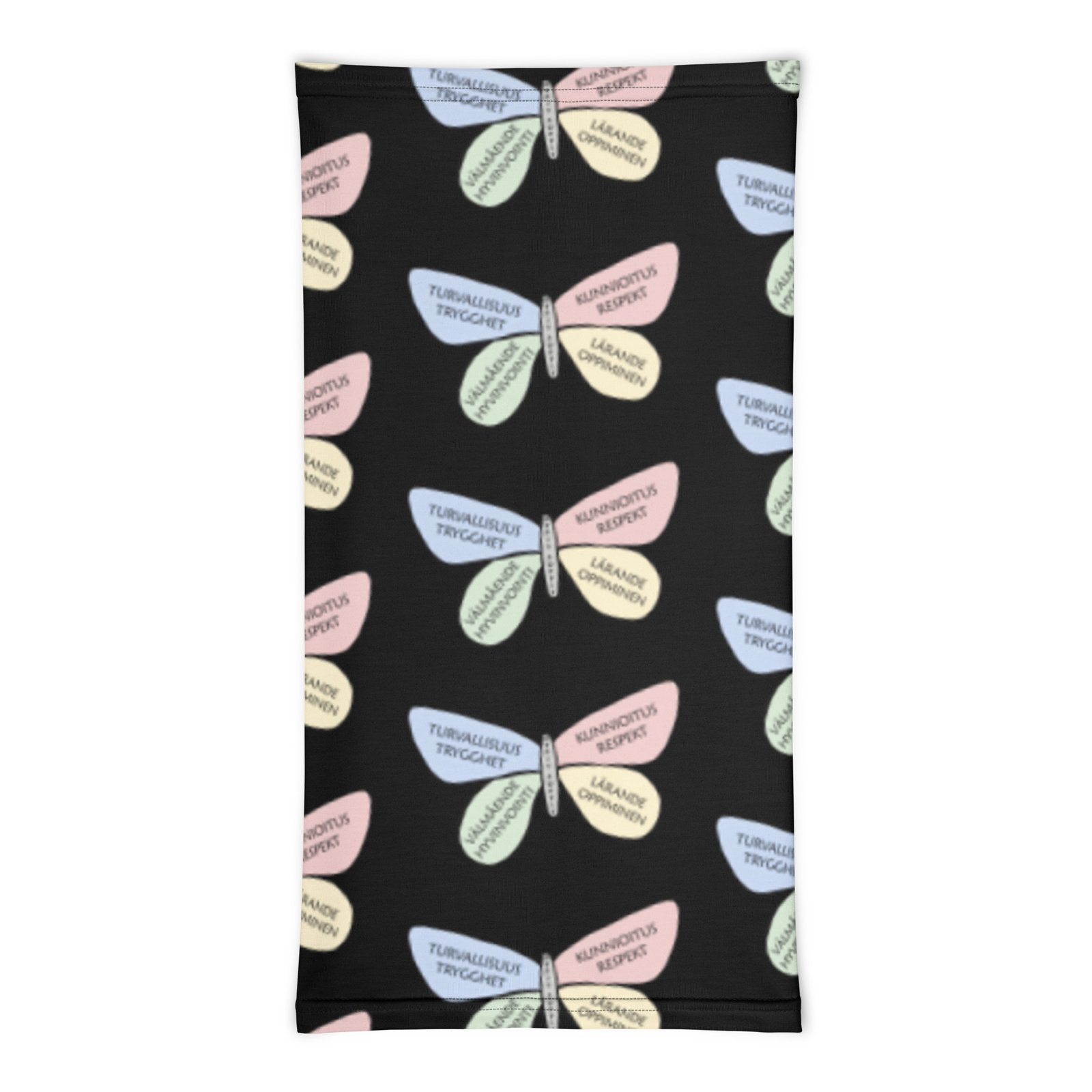 Tubhalsduk Svart – Fjäril är en mångsidig favorit för både barn och vuxna. Den svarta botten har ett fint mönster med OppisPoppis-fjärilen. Använd den som halsduk, pannband eller ansiktsskydd. Tyget är mjukt, stretchigt och andas bra, vilket gör den bekväm hela dagen.