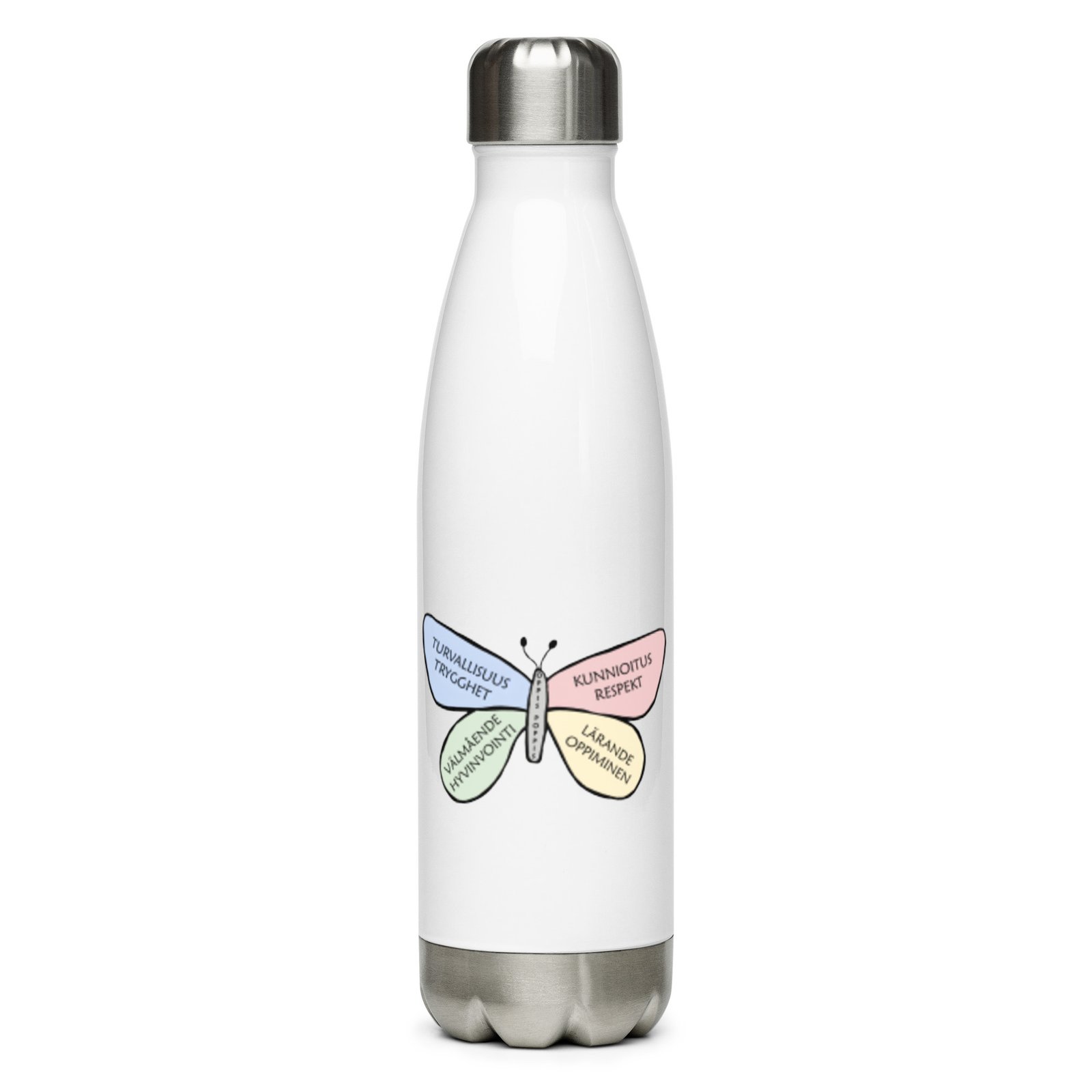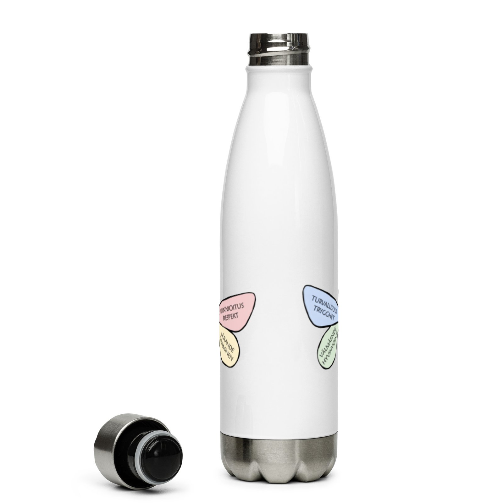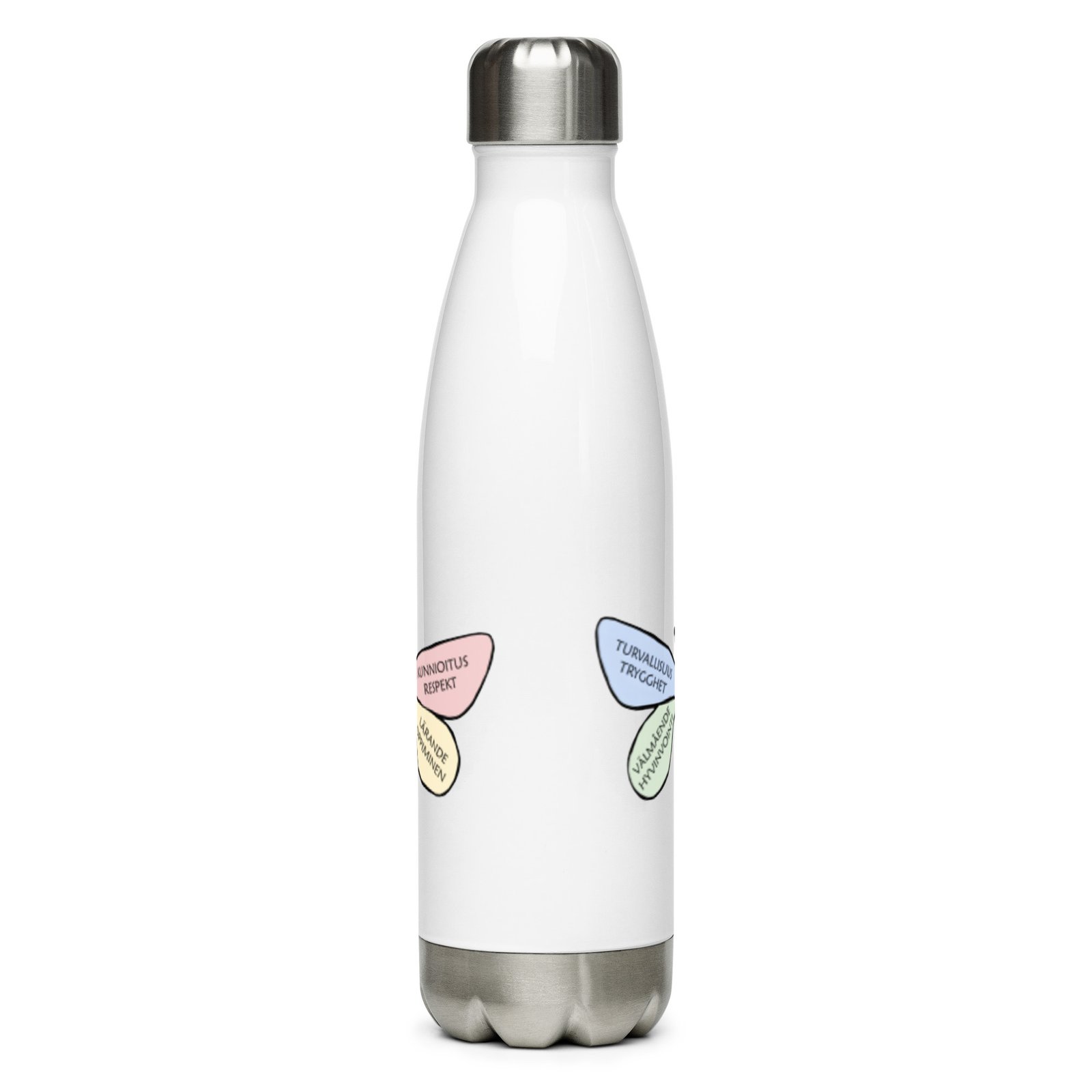 Vattenflaska – S:t Karins Svenska skola är perfekt att ta med varje dag. Den har ett fint mönster med skolans logo runt hela flaskan. Flaskan är gjord i rostfritt stål och håller din dryck varm eller kall i flera timmar. Den är tät och luktfri, så du kan tryggt ha den i väskan på väg till skolan, jobbet eller utflykten.