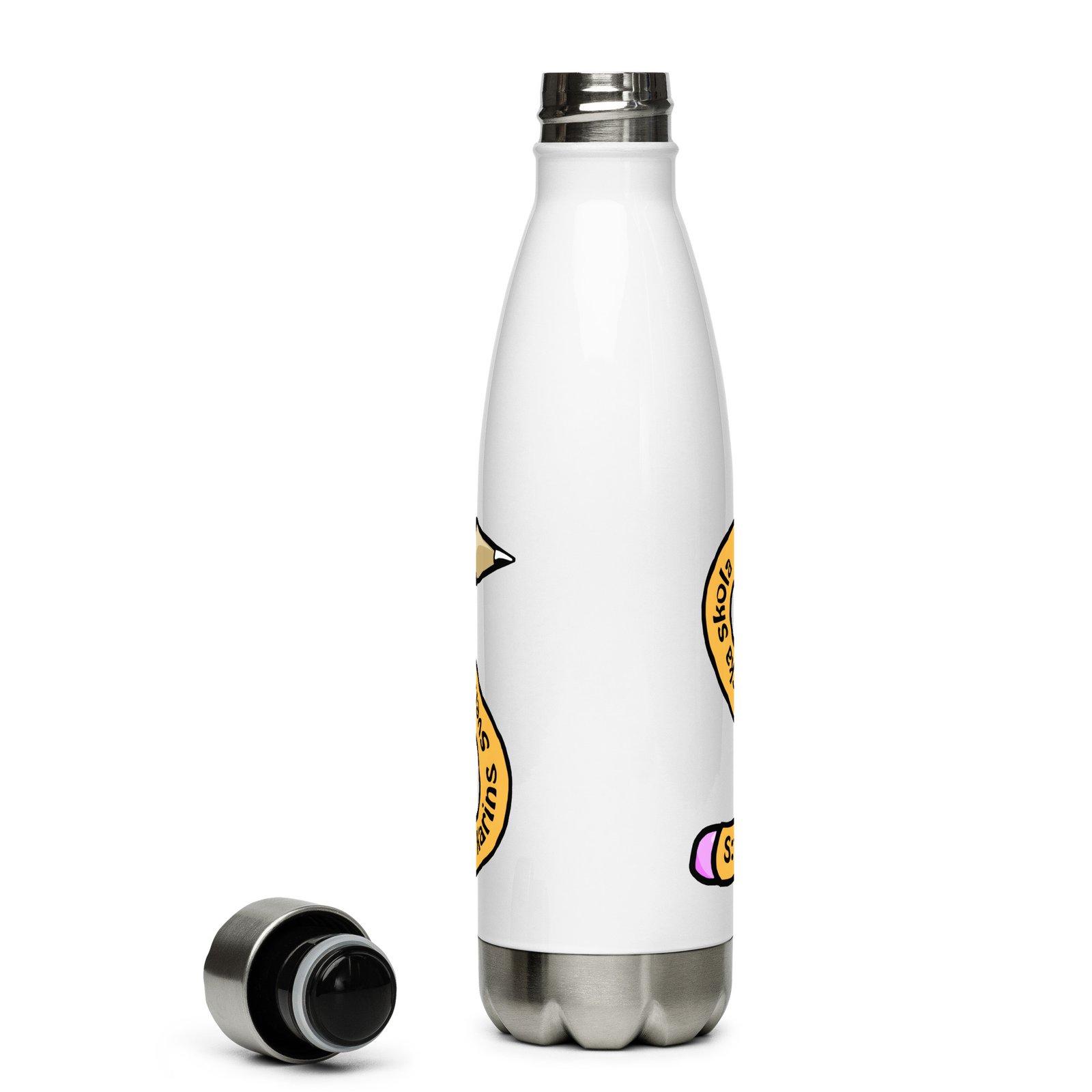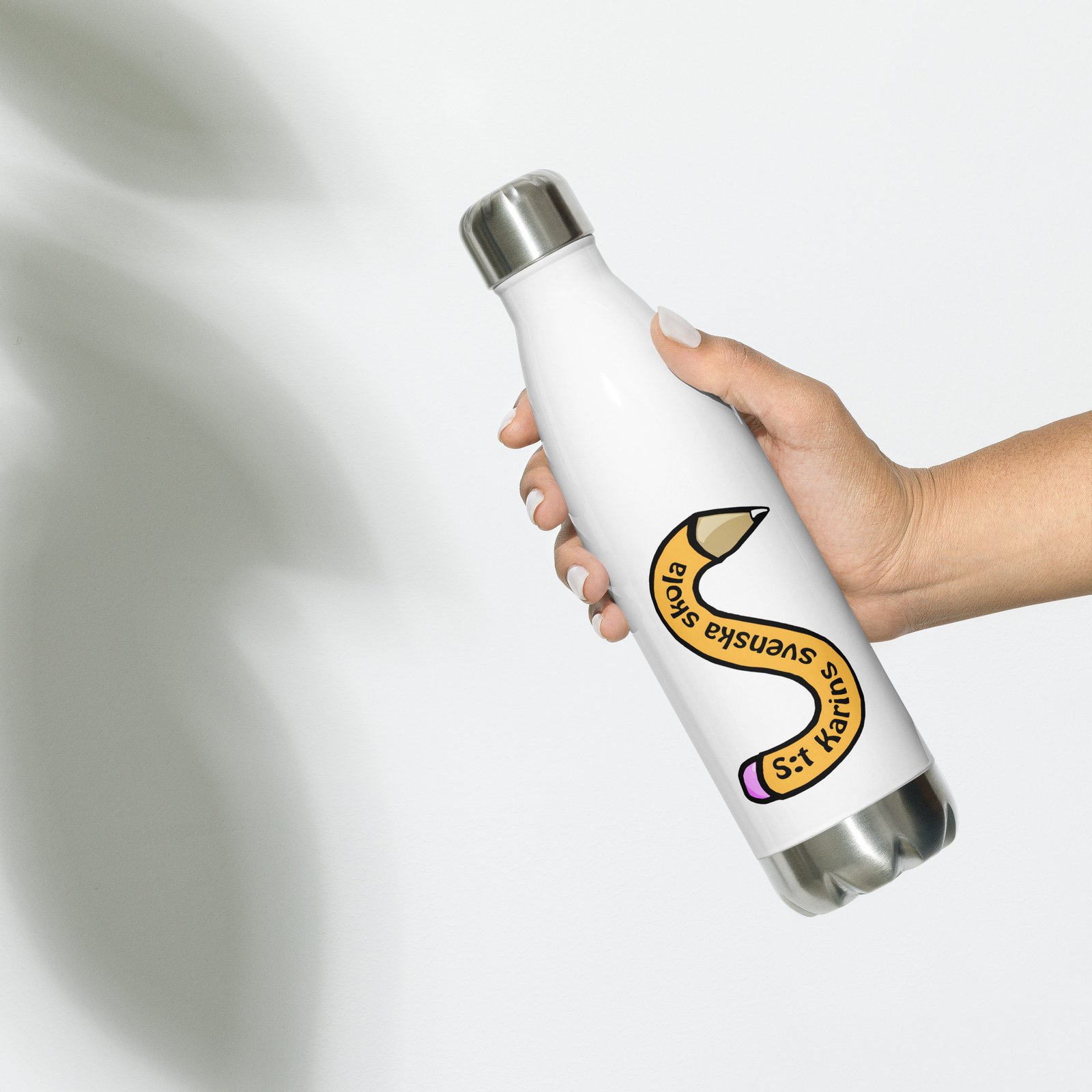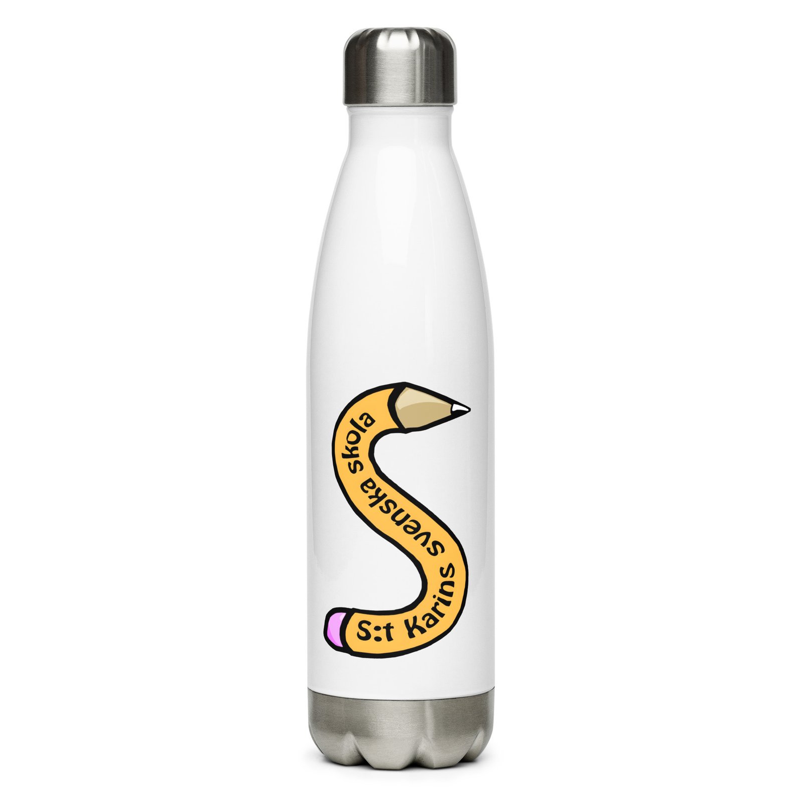 Vattenflaska – S:t Karins Svenska skola är perfekt att ta med varje dag. Den har ett fint mönster med skolans logo runt hela flaskan. Flaskan är gjord i rostfritt stål och håller din dryck varm eller kall i flera timmar. Den är tät och luktfri, så du kan tryggt ha den i väskan på väg till skolan, jobbet eller utflykten.
